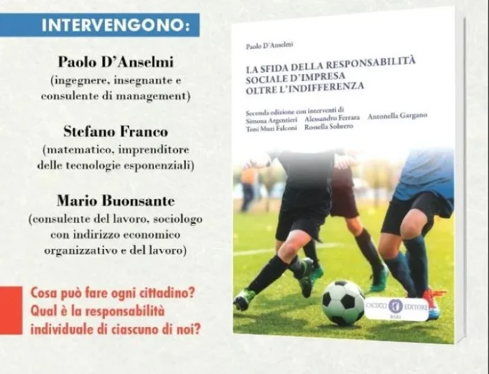 Qualche sera fa, sono stato invitato a co-moderare la presentazione del libro di Paolo d’Anselmi “La sfida della Responsabilità sociale d’impresa oltre l’indifferenza” edito da Cacucci Editore. Paolo è un amico, mi fa sempre piacere dialogare con lui ogni volta che ce ne sia l’occasione. In questo caso, la presentazione del libro è avvenuta a Mola di Bari, nel comitato politico di Giangrazio di Rutigliano (già sindaco e attualmente consigliere comunale), insieme anche a Mario Buonsante, consulente d’impresa.