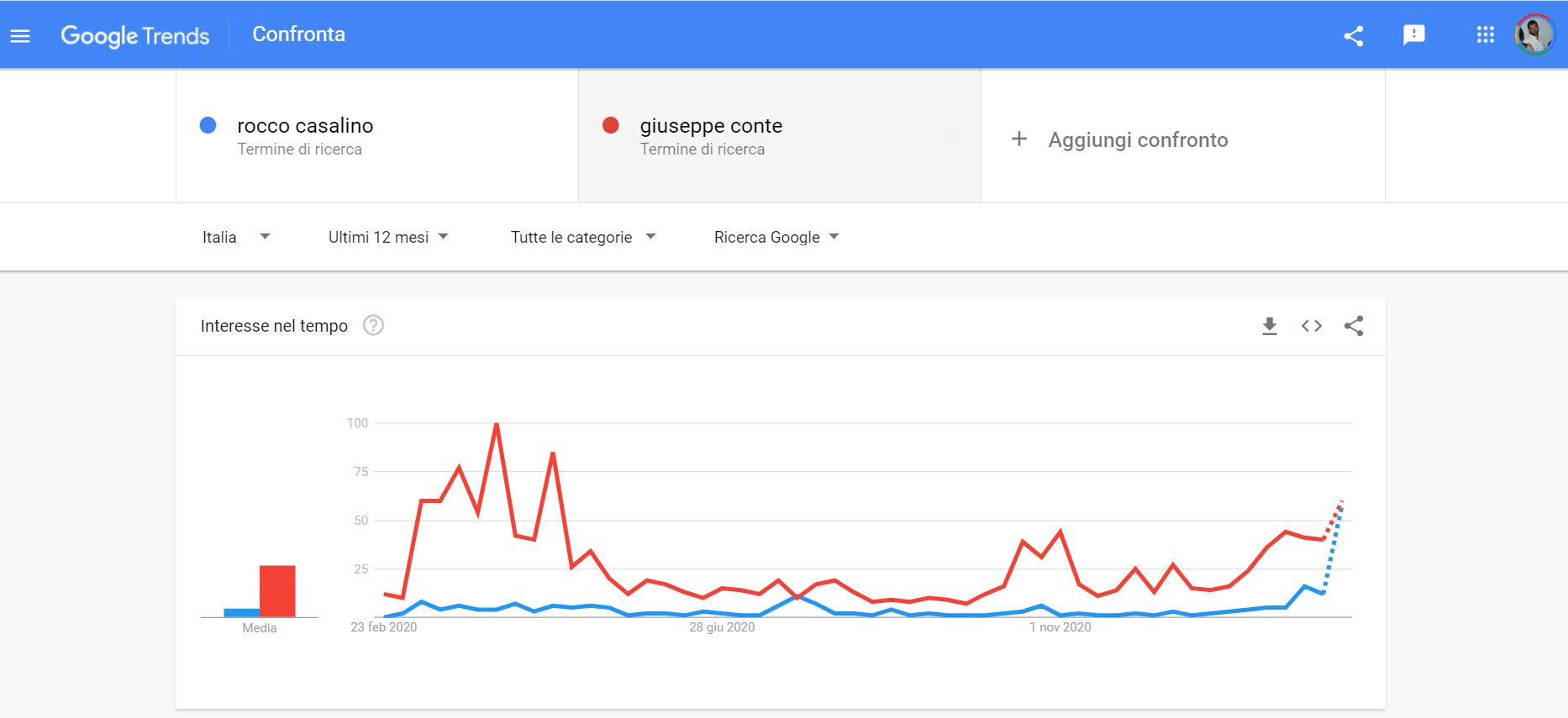 Approfondendo un po’, ho anche notato che i picchi di notorietà di Giuseppe Conte su Google corrispondevano pari pari ai picchi di notorietà di Rocco Casalino.